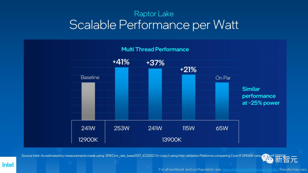 这次英特尔在能效上也是下了大功夫,宣称新旗舰13900k的每瓦多线程性能比上代12900k最高提升了41%。