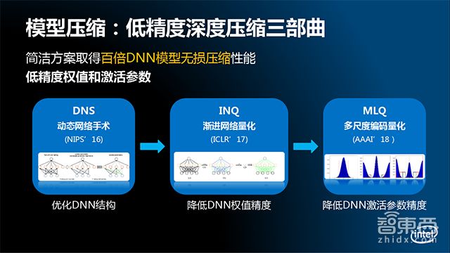 英特尔在此方向上提出了一套低精度的深度压缩解决方案,它可以将DNN的权重参数和激活值表述成低精度的二进制表示,并且,可以实现百倍级的无损压缩,这样就为深度学习推断在硬件和软件上的加速奠定了基础。