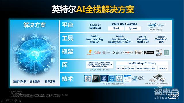 然而,光有芯片是不够的,为此,英特尔还提供了端到端的AI全套解决方案。其中包括多种计算、存储网络硬件平台;多种软件工具、行数库;优化的开源框架以及各种人工智能平台。