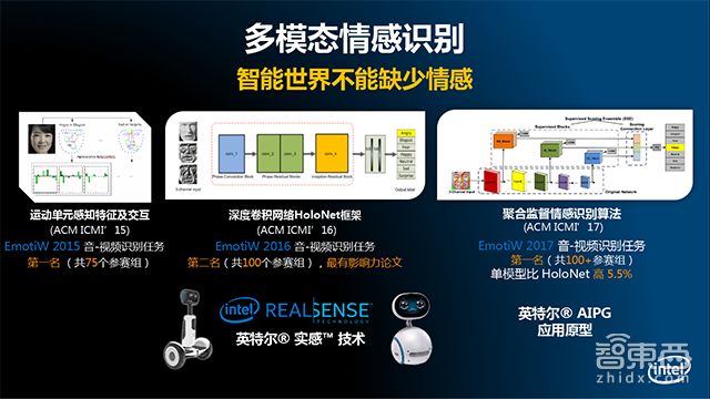 2016年,英特尔研发出了全新的深度神经网络算法HoloNet,其速度很快,在普通的CPU上运行速度可达上每帧百秒。这样可以满足机器人、智能家居、在线教育应用场景的使用需求。2017年,英特尔又提出了全新聚合监督的情感识别算法,该算法取得了单模型比HoloNet高5.5%的识别率,通过多模型的融合在去年比赛当中再次获得第一名。