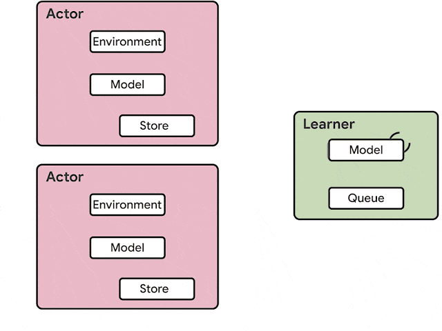 通常,Actor会更新推理模型的参数,并且在收集到足够数量的观察结果之后,会将观察结果和动作的轨迹发送给learner,从而对learner进行优化。在这种架构中,learner使用来自数百台机器上的分布式推理的输入在GPU上训练模型。