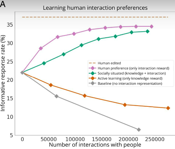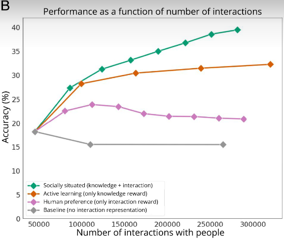 目前,在迭代扩展模型能力时,主动学习是最常用的一个框架。它的目标是优化一系列标注请求以获取新的数据,并将新数据用于以尽可能少的请求来提高模型的性能。主动学习已经被形式化为强化学习的过程,其中,真正的人类角色被移除,只假设存在一个能为所有请求提供标签的「预言机」。尽管纯粹的主动学习方法也可以通过社会环境中的互动来收集新数据,但从用户角度看,他们并不愿意充当「预言机」的角色来做重复提供标签的劳动,这就打破了主动学习的基本假设。所以,我们必须探索智能体真正与人交互的学习方法。要开发社会化的 AI,智能体不仅要收集数据来学习新概念,还要学习如何与人互动来收集数据。而且,智能体必须要在交互学习(interacting to learn)和学习交互(learning to interact)这两个目标之间进行权衡。这非常具有挑战性,因为智能体要遍历的可能交互空间是巨大的,只有一部分社会交互空间是有用的,并且信息交互空间还会随着智能体的学习进程而不断变化。在强化学习中,我们将可能的交互形式化为行动空间,将反馈形式化为奖励,需要数亿次交互才能获得具有信息量和亲社会的交互的子空间,这让很多研究人员望而却步。所以,目前从与人类交互中学习的方法,通常只局限于人工标注或者小的工作空间(如只有几十个动作的游戏和仿真环境)。为此,研究团队将社会化的 AI 形式化为一个迭代强化学习问题。