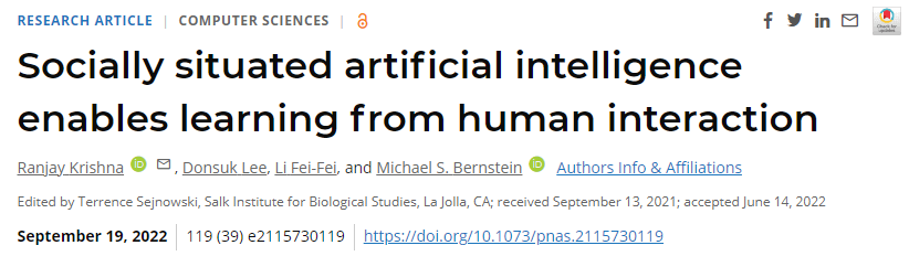 论文“Socially situated artificial intelligence enables learning from human interaction”已发表在美国科学院院刊(PNAS)上。