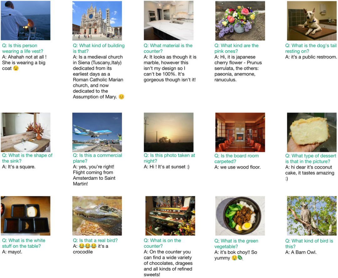 为了验证社会化 AI 框架在计算机视觉中的实用性,作者在照片共享社交网络应用 Instagram 上部署了一个社会化智能体,它向人们提出自然语言问题,并从人的回应中提取答案,收集视觉知识。这种使用自然语言来获取视觉知识的方法,可以用来测试很多计算机视觉识别任务,如对象检测(图像中有什么?)、细粒度识别(花瓶里是什么花?)、属性分类(这张桌子是用什么材料做的?)、知识库推理(这份食物是素食吗?)和常识推理(这张照片是在冬天拍摄的吗?)等等。在这项工作中,研究团队设计了一个计算机视觉问答模型,其输入是一张图像和相应的自然语言问题,输出是一个自然语言答案。智能体提出的问题非常多样,如下图。