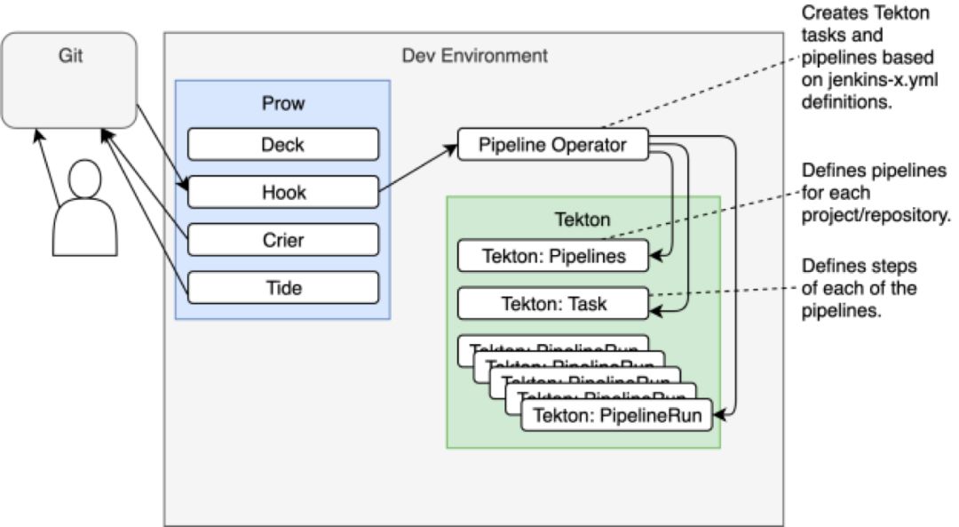 当Prow Hook收到来自Git webhook的请求时,它会将其转发给Jenkins X Pipeline Operator。Operator的职责是从库中取回用于初始化流程的jenkins-x.yml文件,并将其转换为Tekton Tasks和Pipelines。反过来,它们定义了将变更push到Git后,应该被执行的完整流水线。