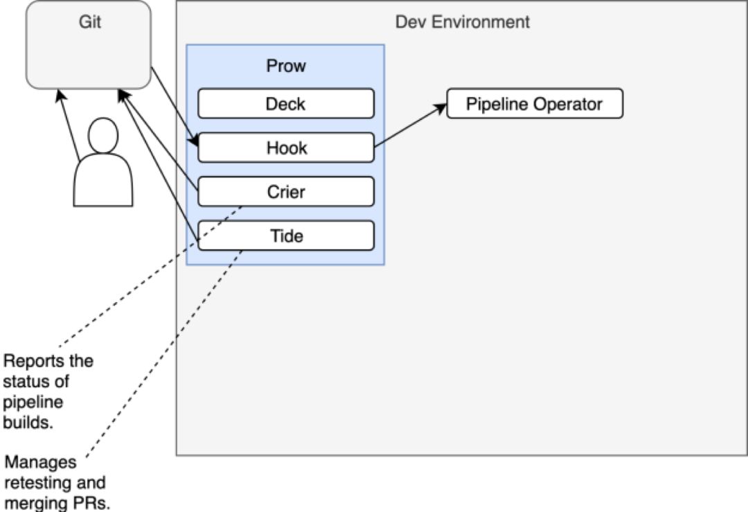 Prow由几个不同的组件组成(例如,Deck,Hook,Crier,Tide等等)。然而,我们并不会深入介绍各个组件的职责。此刻,最需要留意的重要事项是Prow是群集的入口。它接收所有的Git请求,包含产生于Git动作的(例如push)与产生于评论中斜杠命令的。
