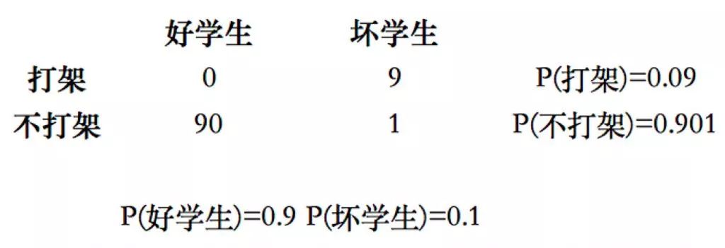 “十个坏学生有九个爱打架”就意味着“坏学生”打架的概率P(打架|坏学生)=0.9,假设根据训导处历史记录坏学生占学生总数P(坏学生)=0.1、打架发生的概率是P(打架)=0.09,那么这时如果发生打架事件,就可以通过贝叶斯公式判断出当事学生是“坏学生”的概率P(坏学生|打架)=P(打架|坏学生)×P(坏学生)÷P(打架)=1.0,即该学生100%是“坏学生”。