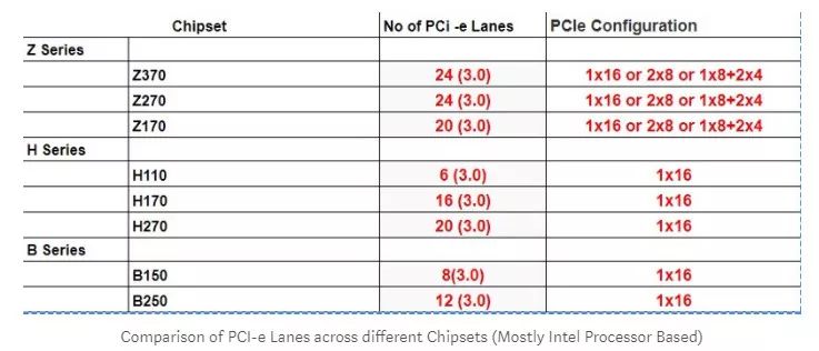下表给出了在不同芯片组下可用 PCIe 通道的个数: