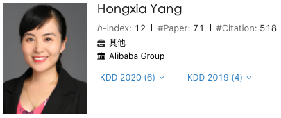 第二名是来自阿里集团的杨红霞,现任阿里巴巴资深算法专家。共入选6篇,相较于去年增加了2篇。