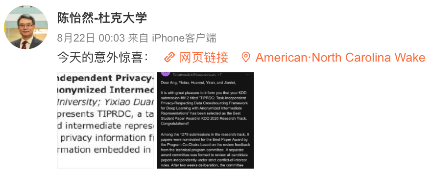 他的导师陈怡然教授还在微博上表示庆祝团队成员摘得最佳学生论文奖。陈怡然教授现任杜克大学电子与计算机工程系教授、杜克大学计算进化智能中心主任、美国 NSF 新型可持续智能计算中心主任。