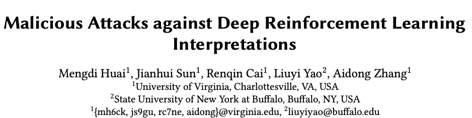 来自弗吉尼亚大学的 Mengdi Huai、Jianhui Sun、Renqin Cai、Aidong Zhang 和来自纽约州立大学布法罗分校的 Liuyi Yao 获得了最佳论文的亚军,获奖论文是「Malicious Attacks against Deep Reinforcement Learning Interpretations」。