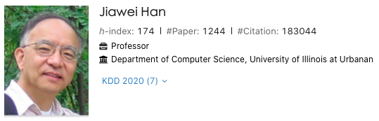 据Aminer统计,来自美国伊利诺伊大学香槟分校计算机系教授韩家炜共入选7篇,位列华人榜首。曾发表过1244篇论文的他,如今论文引用数已达到了183044。