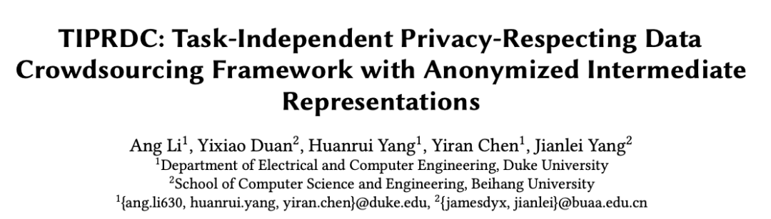 杜克大学的 Ang Li、Huanrui Yang、陈怡然和北京航空航天大学的段逸骁、杨建磊摘得最佳学生论文奖,获奖论文为「TIPRDC: Task-Independent Privacy-Respecting Data Crowdsourcing Framework for Deep Learning with Anonymized Intermediate Representations」。