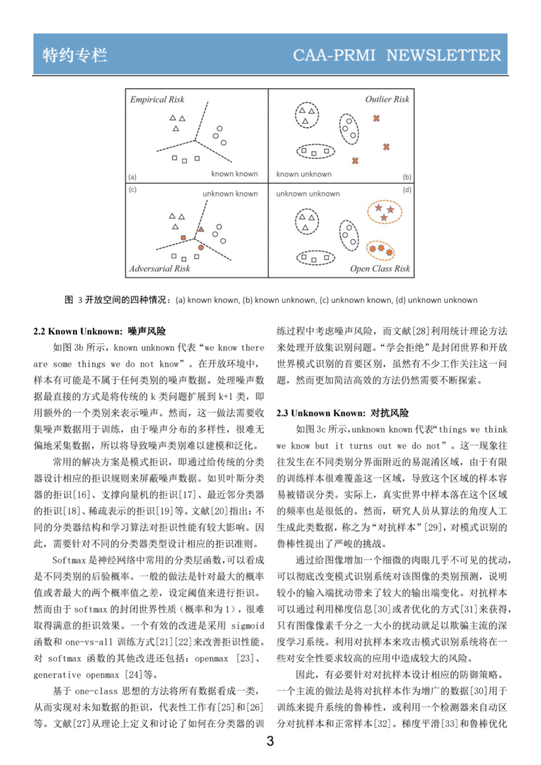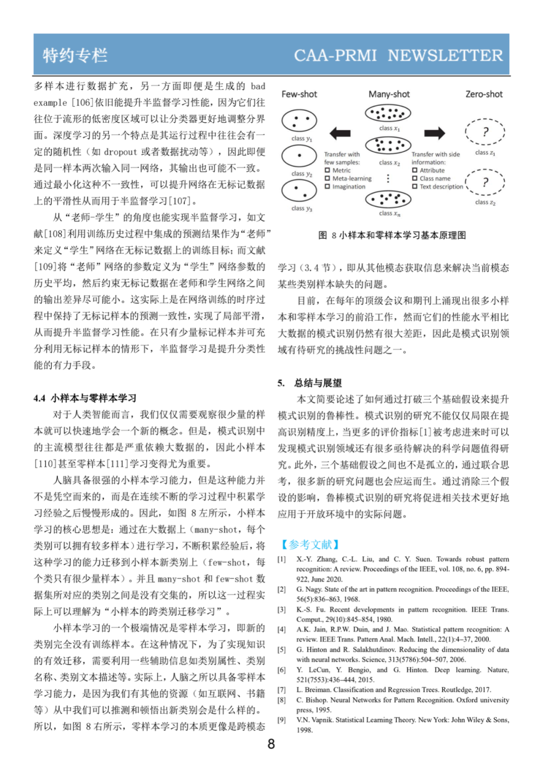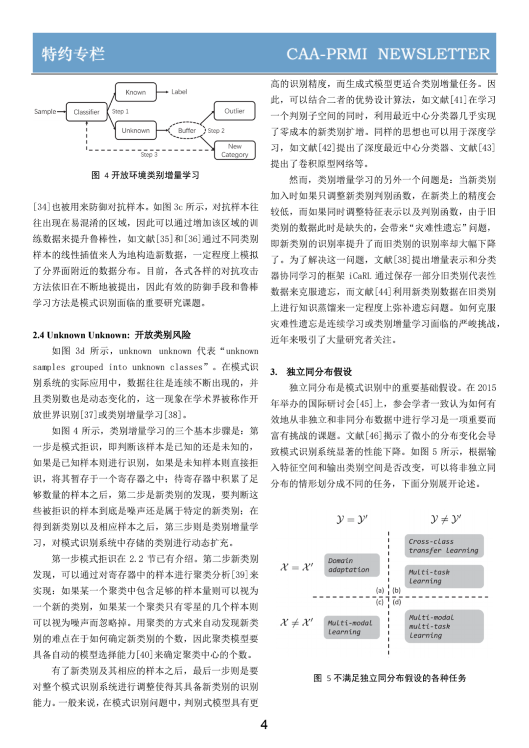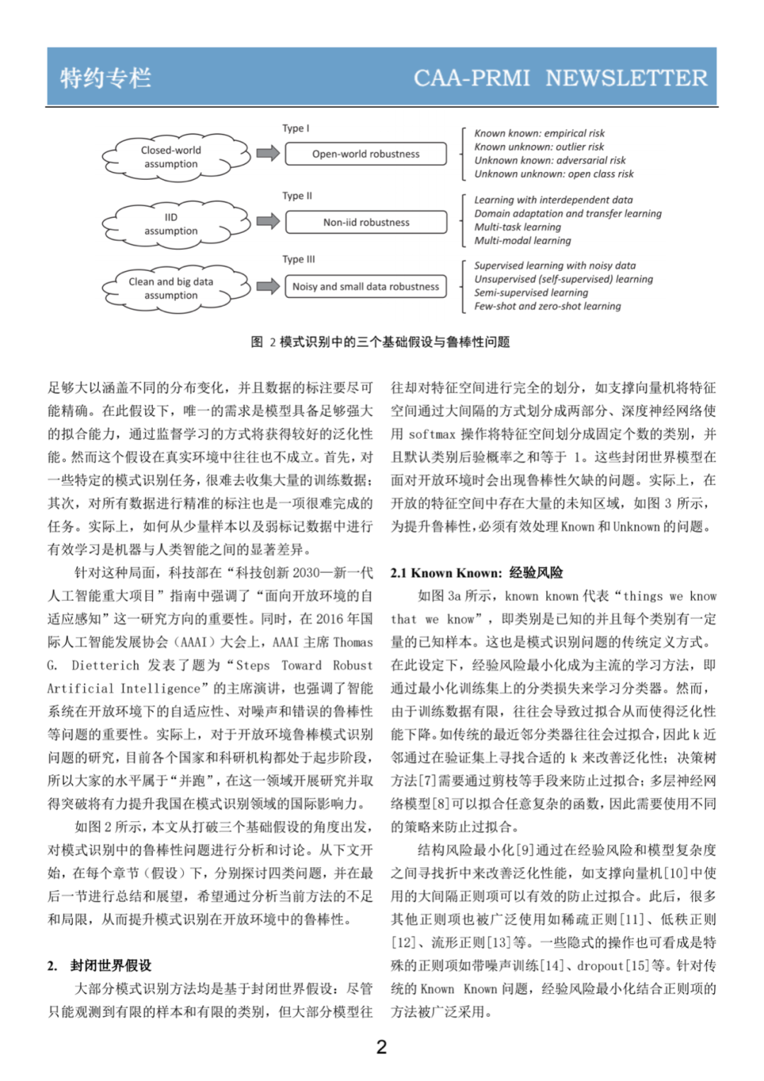 目前诸多模式识别任务的识别精度获得不断提升,在一些任务上甚至超越了人的水平。单从识别精度的角度来看,模式识别似乎已经是一个被解决了的问题。然而,高精度的模式识别系统在实际应用中依旧会出现不稳定和不可靠的现象。因此,开放环境下的鲁棒性成为制约模式识别技术发展的新瓶颈。实际上,在大部分模式识别模型和算法背后蕴含着三个基础假设:封闭世界假设、独立同分布假设、以及大数据假设。这三个假设直接或间接影响了模式识别系统的鲁棒性,并且是造成机器智能和人类智能之间差异的主要原因。本文简要论述如何通过打破三个基础假设来提升模式识别系统的鲁棒性。