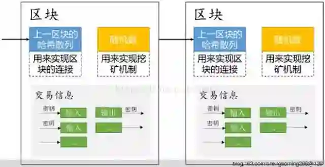 从技术上来讲,区块是一种记录交易的数据结构,反映了一笔交易的资金流向。系统中已经达成的交易的区块连接在一起形成了一条主链,所有参与计算的节点都记录了主链或主链的一部分。一个区块包含以下三部分:交易信息、前一个区块形成的哈希散列、随机数。交易信息是区块所承载的任务数据,具体包括交易双方的私钥、交易的数量、电子货币的数字签名等;前一个区块形成的哈希散列用来将区块连接起来,实现过往交易的顺序排列;随机数是交易达成的核心,所有矿工节点竞争计算随机数的答案,最快得到答案的节点生成一个新的区块,并广播到所有节点进行更新,如此完成一笔交易。