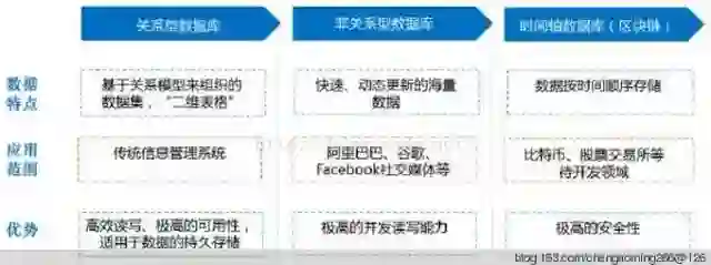 从应用角度看,区块链技术是维护一个不断增长的数据记录的分布式数据库技术,数据除了交易数据还可以有其他表现形式。区块链集体维护数据库的技术特点,不同于以往任何一种数据库形式。以往的数据库可分为关系型数据库和非关系型数据库(NoSQL),两者各有特点:关系型数据库是最原始的数据库形式,是基于实体关系模型建立的,代表有Oracle、MySQL、Microsoft SQL Server等;随着WEB2.0和SNS的兴起,传统关系数据库在处理数据上暴露了很多难以克服的问题,而非关系型的数据库由于其自身的特点得到了迅速发展,代表有HBase、MongoDb、Oracle BDB等。区块链对于数据库的创新不同于以往任何一种数据库形式,它是一种分布式的、集体维护的、按照时间顺序将事件数据排列的“时间轴数据库”。