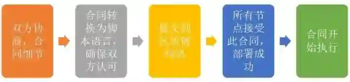 比特币中的交易是使用比特币区块链底层平台定义的一套脚本语言来写的,由于当初比特币区块链系统是按照一个数字货币的模型进行设计的,因此它并不需要这些复杂的能力。但是如果我们需要区块链技术在其他商业场合进行应用,很多时候就需要这些能力。比如我们利用以太坊平台来实现某个业务,那么整个流程是这样子的:
