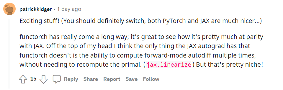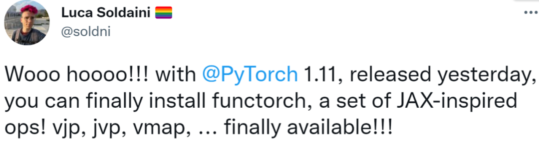 网友也不禁感叹:终于可以安装 functorch,一套受 JAX 启发的 ops!vjp、 jvp、 vmap... 终于可用了!!!