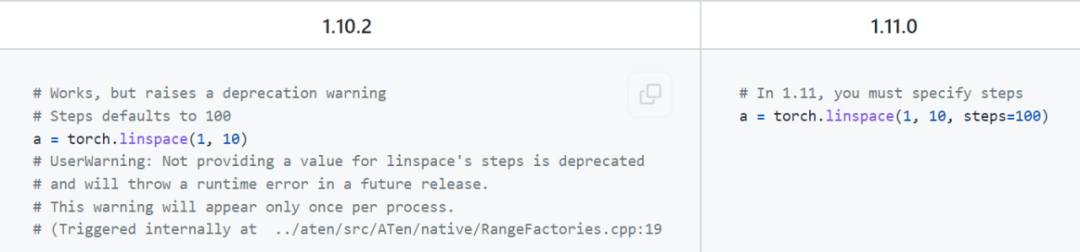 在 torch.linspace 和 torch.logspace 中,steps 参数不再是可选的。此参数在 PyTorch 1.10.2 中默认为 100,但已被弃用。在 PyTorch 1.11 中,它不再是可选的。