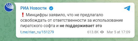 俄罗斯数字化转型部也连忙表态,对盗版软件的使用不予免责和支持。