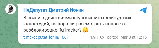 前俄罗斯杜马副主席、斯维尔德洛夫斯克州副州长 Dmitry Ionin 表示:“考虑到好莱坞最大电影制片厂的活动(宣布抵制俄罗斯),现在岂不正好可以解封 RuTracker 了吗?🤔”