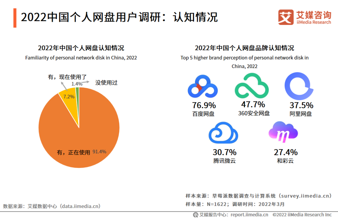 根据艾媒咨询调研数据显示,超过9成用户正在使用个人网盘。在个人网盘品牌认知度方面,百度网盘以76.9%的品牌认知度位列第一。