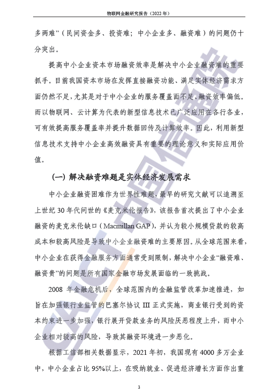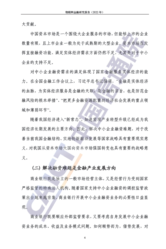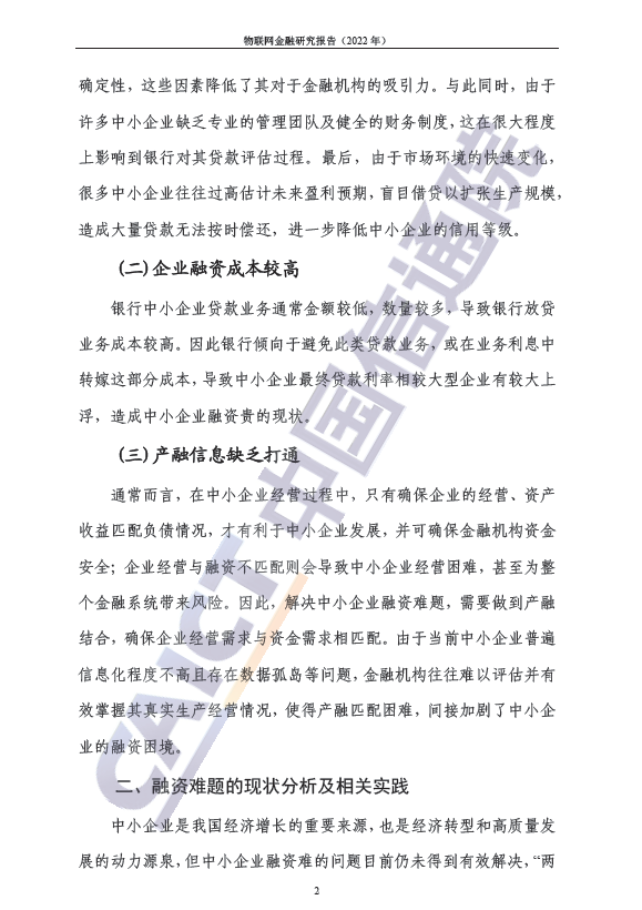 报告深入分析了当前实体经济转型升级面临的银行融资风险较高、企业融资成本较高、产融信息缺乏打通等融资难题,提出了物联网助力金融提升风控能力、拓宽业务范围,实现数据打通、增强分析能力,降低业务成本、提升管理效能,赋能信用体系、促进行业发展的四大新方向。