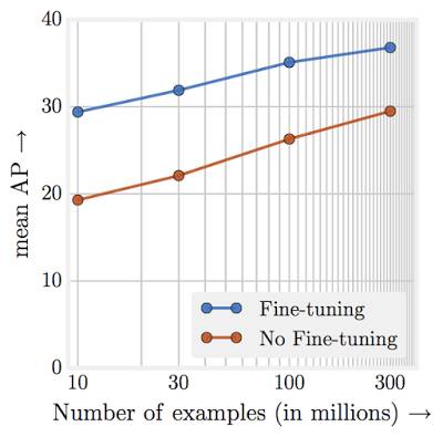表现与训练数据的数量级呈线性递增关系。 也许整个实验最惊人的发现就是视觉任务的表现和用于表征学习的训练数据量(对数)之间的关系了。我们发现它们之间的关系竟然是线性的!即使训练图像达到 3 亿张,我们也并未观察到对所研究的任务产生任何平台效应。