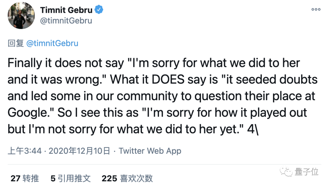 在新发的推文上,Gebru博士认为:他们并没有对我的所作所为感到抱歉,没有承认这是错误的。