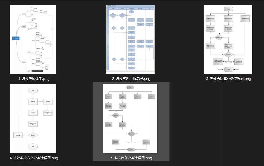 首先,绩效管理系统的流程图梳理,分为绩效管理工作流程图、绩效考核指标库流程图、绩效考核方案流程图、绩效考核计划流程图。