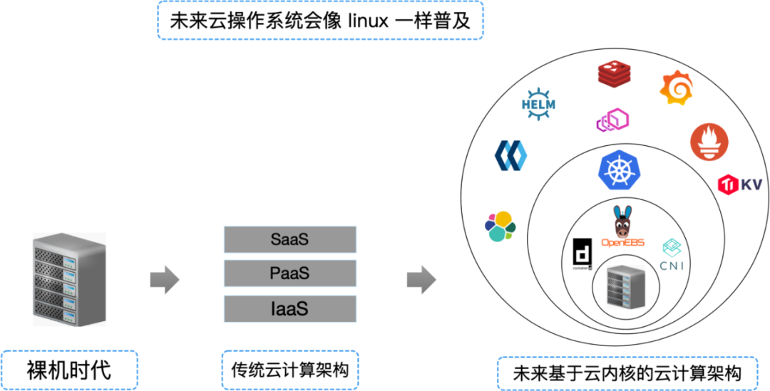 早期单机操作系统是分层架构,后面才演化成今天如 linux windows 的宏内核微内核架构。云操作系统也会有类似发展趋势:以前都是单机应用,而现代应用几乎都是分布式应用。目前,kubernetes 已经成为事实上的“云操作系统内核”,这让能使内核普及的发型版呼之欲出。