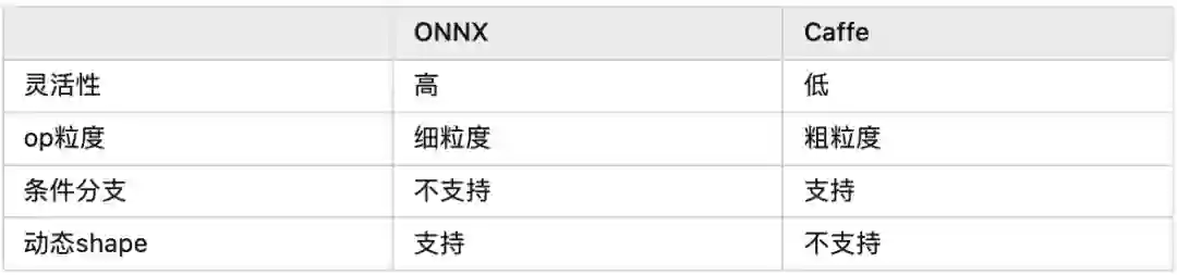 上面的表列了ONNX和Caffe的几点区别,其中最重要的区别就是op的粒度。举个例子,如果对Bert的Attention层做转换,ONNX会把它变成MatMul,Scale,SoftMax的组合,而Caffe可能会直接生成一个叫做Multi-Head Attention的层,同时告诉CUDA工程师:“你去给我写一个大kernel“(很怀疑发展到最后会不会把ResNet50都变成一个层。。。)