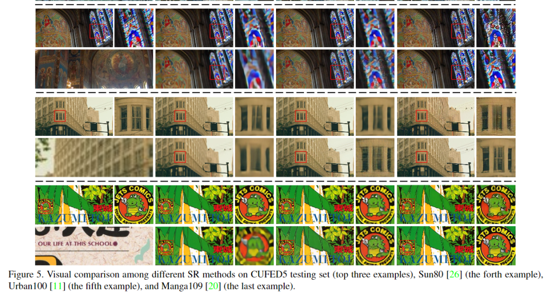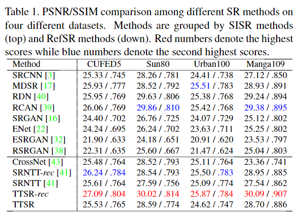 表1显示了定量评估结果。红色数字表示最高分,蓝色数字表示第二高分。如比较结果所示,TTSR在所有四个测试数据集上均明显优于最新的SISR方法和最新的RefSR方法。在Sun80和Manga109数据集上仍然具有最佳性能,在其他两个数据集CUFED5和Urban100上,TTSR模型可以达到与最新模型相当的性能。