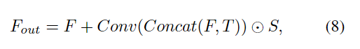 其中Si表示软注意力图的第i个位置。首先将HR纹理特征T与LR功能F融合在一起,以利用LR图像中的更多信息,而不是直接应用注意力图S,将这些融合的特征进一步与软注意图逐元素相乘,然后再添加到F中。