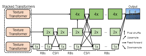 图3.跨尺度特征集成模块(CSFI)以跨尺度方式堆叠多个纹理转换器的体系结构。RB表示一组残余块。