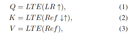 纹理转换器的结构如图2所示。LR,LR↑和Ref分别代表输入图像,4倍bicubic-upsampled 的输入图像和参考图像。依次对Ref应用具有相同4倍因子的bicubic下采样和上采样,以获得与LR↑domain-consistent的Ref↓↑。纹理转换器将Ref,Ref↓↑,LR↑和主干产生的LR特征作为输入,并输出同样大小的特征图,该特征图将进一步用于生成HR预测。