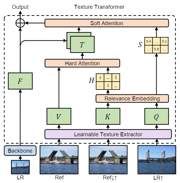 纹理转换器包含四个部分:可学习的纹理提取器(LTE),相关性嵌入模块(RE),用于功能转移的硬注意模块(HA)和用于特征合成的软注意模块(SA)。