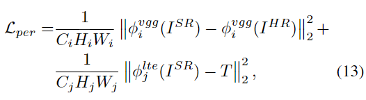 其中第一部分是传统的感知损失,其中φvggi(·)表示第i层的VGG19特征图,而(Ci,Hi,Wi)表示该层的特征图的形状。ISR是预测的SR图像。我们的感知损失的第二部分是传递感知损失,其中φltej(·)表示从LTE的第j层提取的纹理特征图,而(Cj,Hj,Wj)表示该层的形状。这种传递感知损失将预测的SR图像约束为具有与传递的纹理特征T相似的纹理特征,这使更有效地传递Ref纹理。