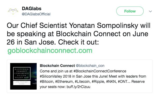 “我们的首席科学家 Yonatan Sompolinsky 将在圣何塞的 Blockchain Connect 大会上讲话。”