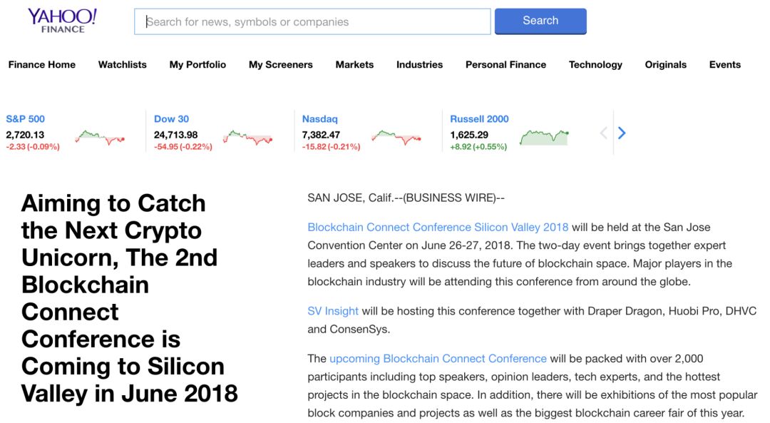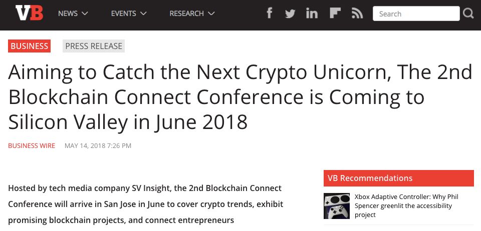 美国主流科技媒体 VentureBeat 的报道是:“意在捕捉到下一个区块链独角兽,Blockchain Connect 大会将于 2018 年六月来到湾区。”