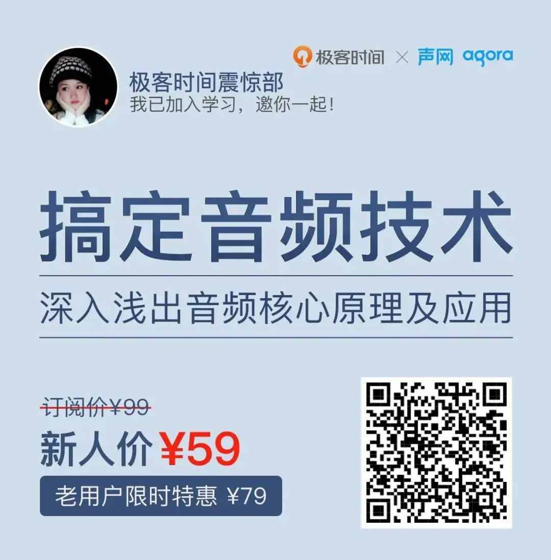 最近,看到他们跟极客时间联合出了 2 门关于音频、视频技术相关的课,第一时间就订阅来看,不得不说,想学音视频技术,还得看声网的专家,在这个领域,没有比他们更有话语权的了。
