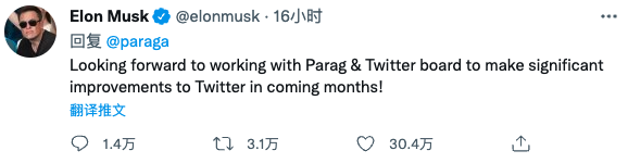对此,马斯克回复道,“期待与 Parag 和 Twitter 董事会合作,在未来几个月将对 Twitter 进行重大改进。”