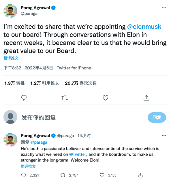 时下马斯克以第一大股东的身份加入,Twitter 现任 CEO 帕拉格·阿格拉瓦尔(Parag Agrawal)发 Twitter 表示,“通过最近几周与埃隆的对话,我们很清楚他将为我们的董事会带来巨大的价值。”