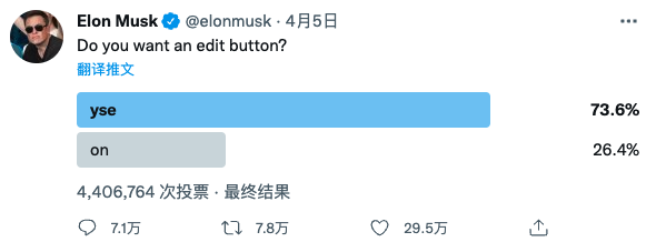 在公开成为 Twitter 最大股东之后,马斯克紧接着就在 Twitter 上发起公开投票,询问网友”在发布推文时,是否需要编辑按钮?“根据最终结果显示,73.6% 网友选择了”是