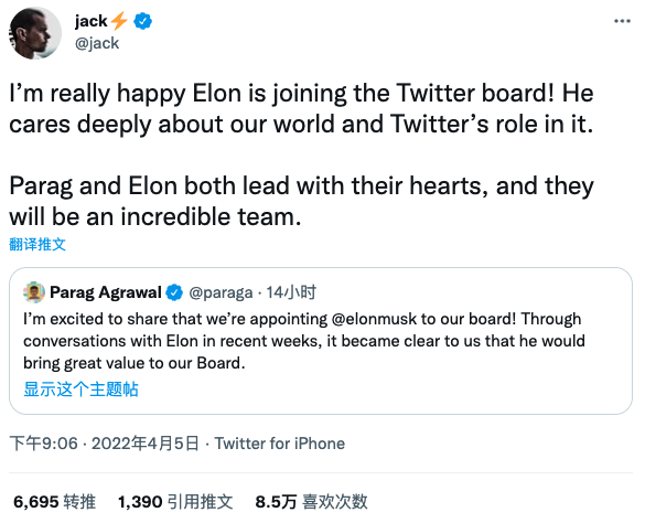 除了现任 CEO 对马斯克的加入表示认可之外,马斯克的好友、Twitter 前 CEO 杰克·多尔西在推文中写道,「我非常高兴埃隆加入 Twitter 董事会!他对我们身处的世界以及 Twitter 所起的作用非常关注。帕拉格和埃隆都是用心来领导团队,相信他们也将成为一个令人惊叹的团队。