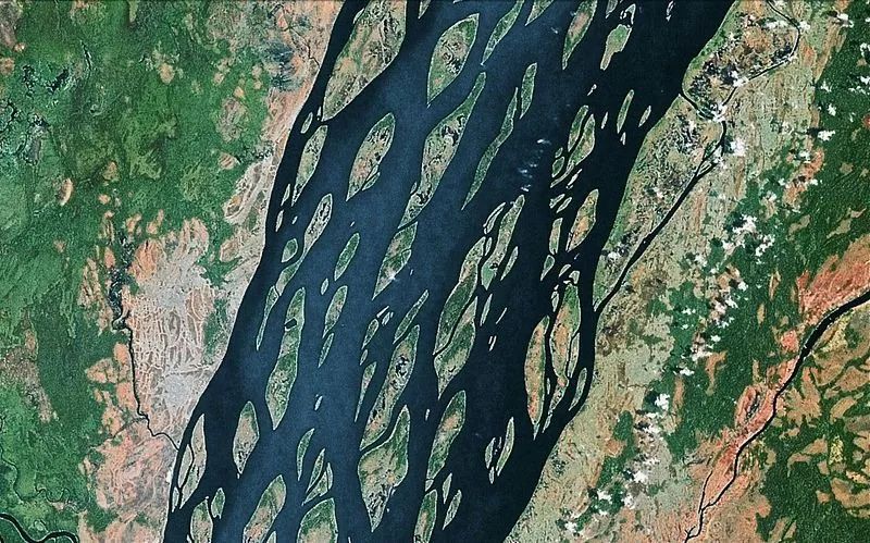 上面3张图片是发源于我国境内,先后流经我国西藏、印度和孟加拉国的雅鲁藏布江(也叫布拉马普特拉河)。雅鲁藏布江在印度阿萨姆邦那一段的辫状河的形态最为曲折繁复。