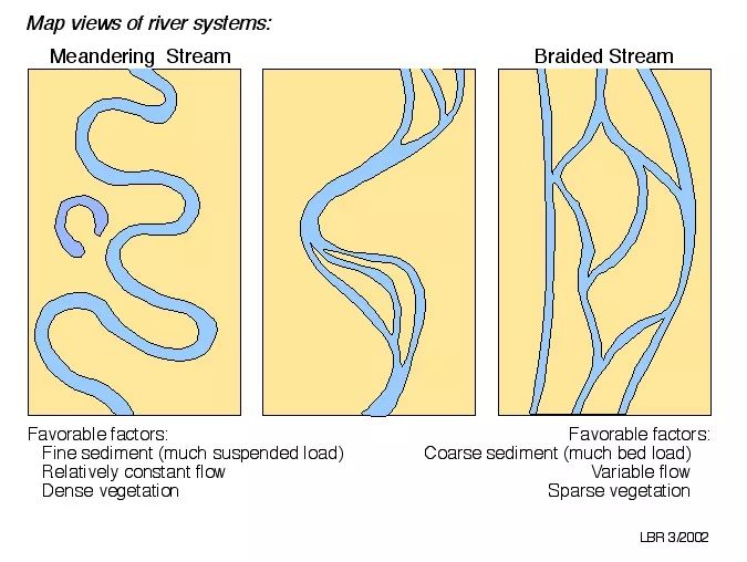 ▲ 左边是弯曲河,右边是辫状河。弯曲河的河床沉积物一般比较细腻,水流也比较稳定。辫状河正好相反。图片来源:Gly Uga/University of Georgia