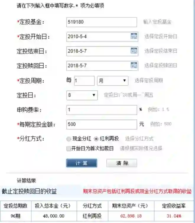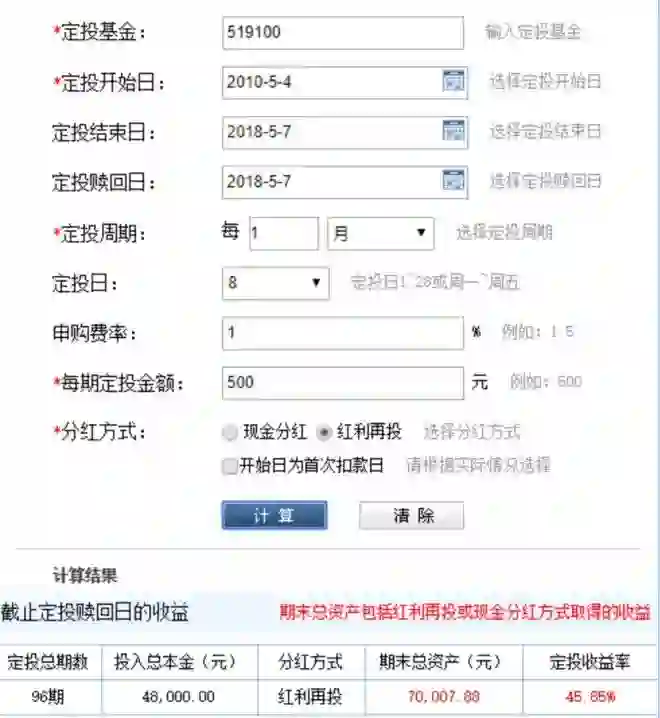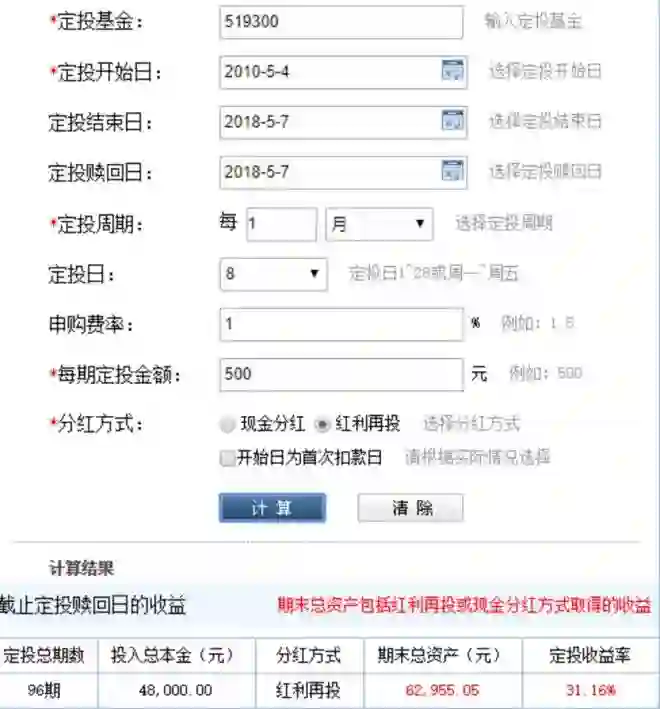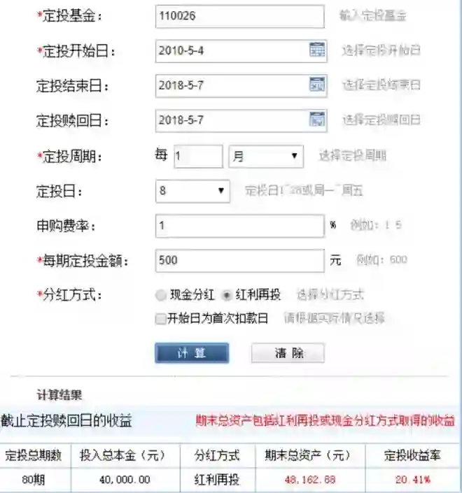 我们就用东方财富网的定投计算器做个简单计算。