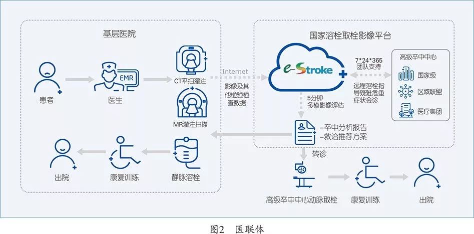 以医疗健康为例,我们将支付方、医院、政府相关部门、保险等多方融合到一个复杂的生态系统中,利用数据来解决医疗质量、公平、成本、安全等医疗行业的根本性问题。东软集团构造了熙康云医院,使得更多的医疗行为从大医院走向基层,实现医疗的公平性。我们帮助政府控制不断上涨的医疗费用,实现医疗的分层次服务,建立个人的动态健康与医疗档案,使医疗更加个性化和精准。通过大数据和人工智能构建医联体(如图2所示),使基层医院更加强大。