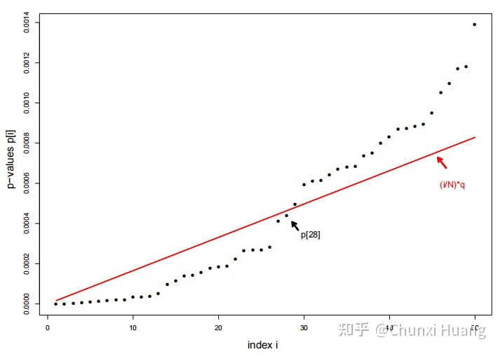 以传统的假设检验为例,设传统假设检验中有 M 个 null hypothesis,一般来说 M 的值通常较小,如:M<20。然而在现代的各种丰富的高维数据场景下,大规模假设检验变成了必须要解决的一个问题。与传统假设检验不同的是,大规模假设检验通常 M 的值较大,如在许多生物信息学的研究中涉及基因组相关的假设检验 M 的值动辄可达几十万乃至上百万。 与小规模的假设检验相比,大规模假设检验的主要问题就在于:如何增加 statistical power (如减少 false negative)?如何控制第一类误差(false postive)?false positive rates 是统计和统计学习中很基础的概念,可以简单写为 ,其也被称为 type I errr。与之相对应的概念则是 false negative rates,也被称为 type II error。 假设我们有 M 个相互独立的测试,每一个测试都提供了一个反对它的 null hypothesis 的 p 值 ,这样一来 M 个 p 值就组成了一个向量 。令 作为一个以 为输入、以接受或拒绝 null hypothesis 的决策为输出的规则。假设我们观察到该规则拒绝了 M 个测试中的 R 个,那么 false discovery proportion(Fdp)可以定义为: ,其中 是 个拒绝的测试中 null hypothesis 实际是正确的数量,换句话说,也就是 false discoveries 的数量。 基于此,规则 的 false discovery rate 就被定义为 Fdp 的期望值,写成:,当然, 时 Fdp 的值则为 0。 上面提到,我们希望在大规模假设检验中控制 false positive,可怎样的方法能够控制呢?乍一看会觉得没头绪,Benjamini 和 Hochberg 给出他们的经典答案:BH procedures。